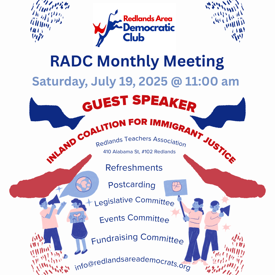 The July monthly meeting of the Redlands Area Democratic Club will occur on Saturday, July 19th, as an in-person meeting, beginning at 11:00 AM. Our special guests will be Inland Coalition for Immigrant Justice. Other action opportunities will also be provided at the meeting.